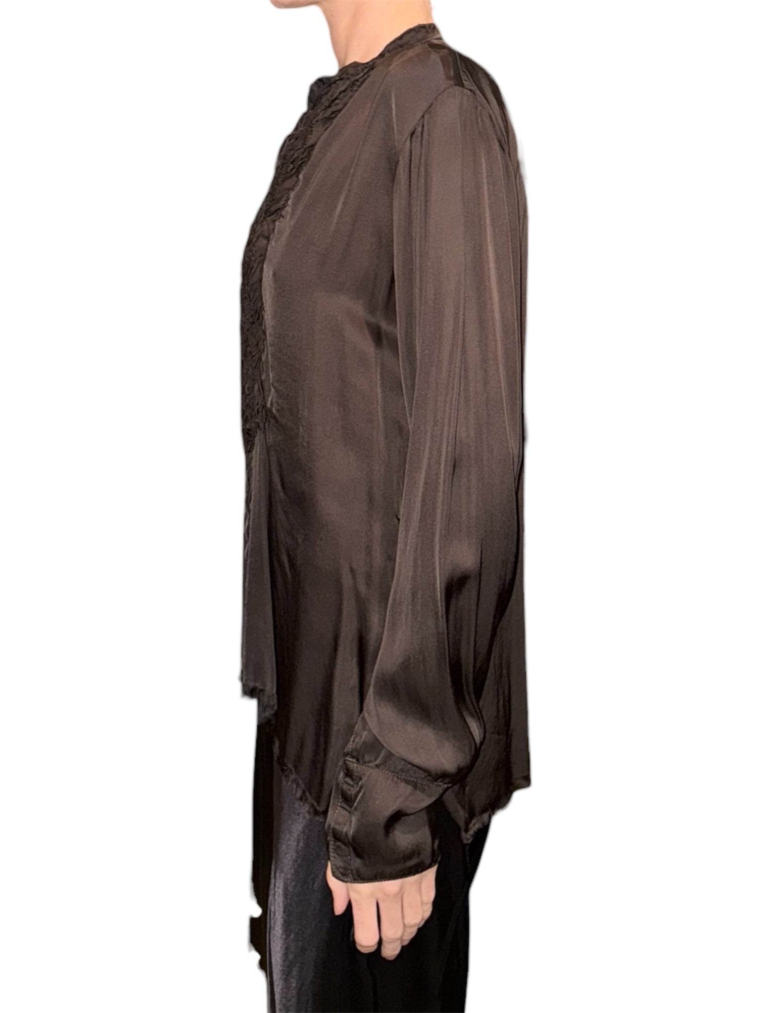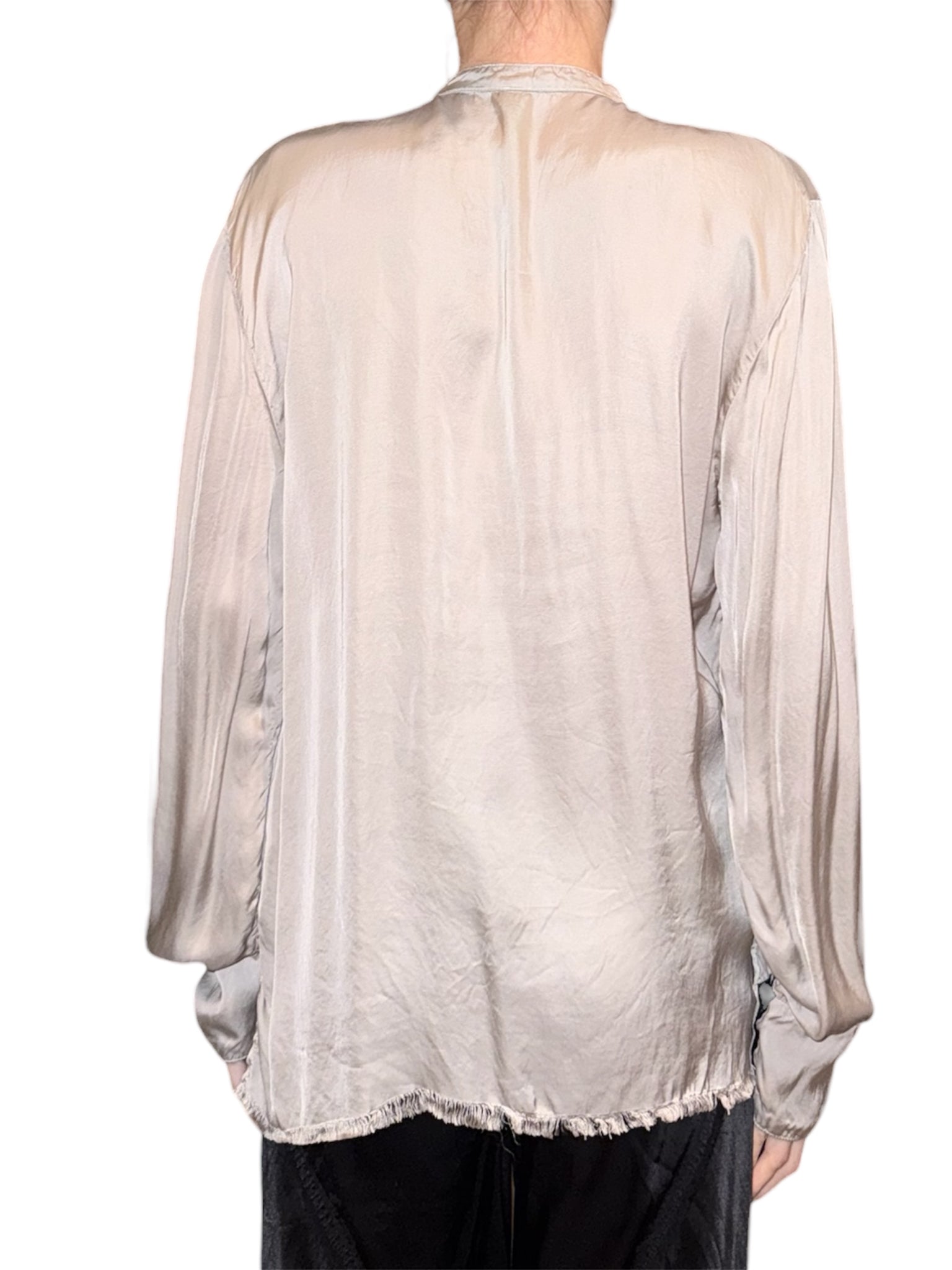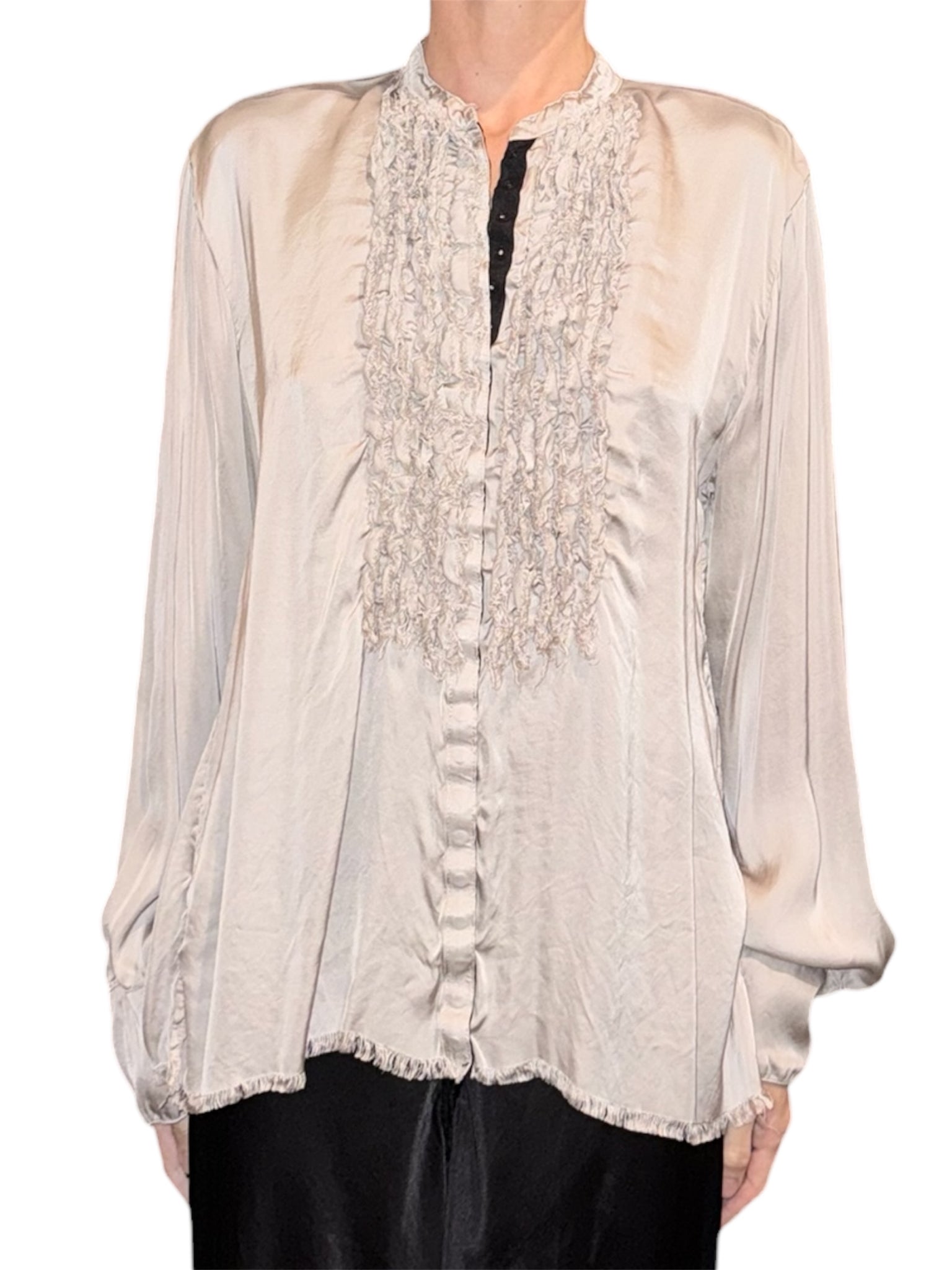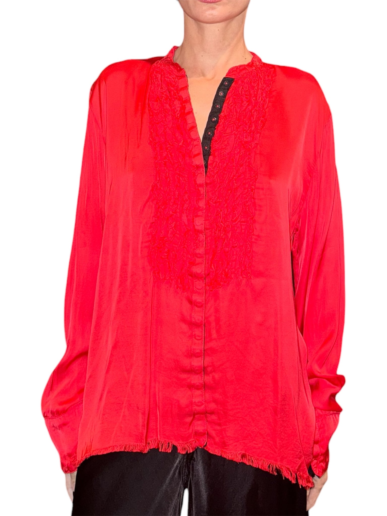 A raw edge satin Tuxedo Shirt with Snaps that is a bold and sensual statement for any occasion.